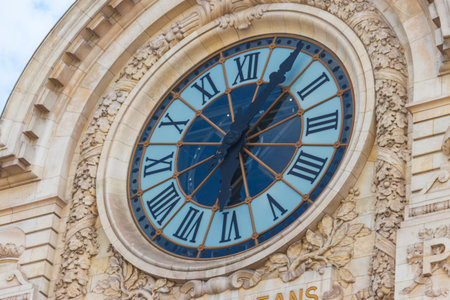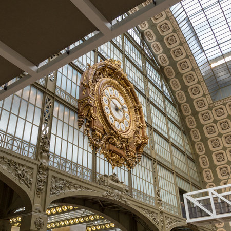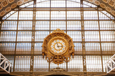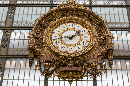 Paris, northern France - July 11, 2017. Close-up of golden clock at the Quai d'Orsay Museum main hall in Paris. Known as the City of Light, it is one of the world's most awesome cultural centers.