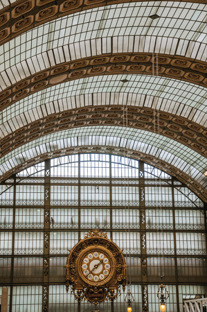Paris, France - July 11, 2017. Golden clock and ceiling at the Quai d'Orsay Museum main hall in Paris. Known as the City of Light, it is one of the world's most awesome cultural centers. Northern France