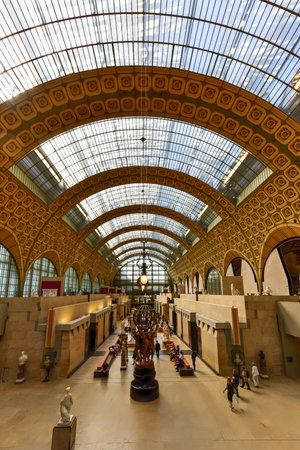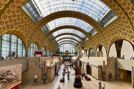 PARIS, FRANCE - APRIL 15, 2023: Main hall of Orsay Museum, French: Musee d Orsay, in former train station building, Paris, France.