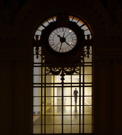 PARIS, FRANCE - MAY 9, 2019: Famous clock with roman numerals and silhouette of man looking into round window in Orsay Museum, Paris, France.