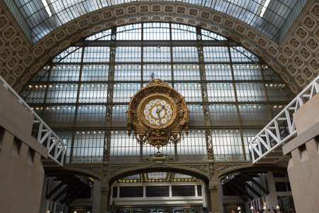 June 16, 2015: Musee dOrsay Clock, Victor Laloux, Main Hall of Musee dOrsay in paris, france, on the Left Bank of the Seine.