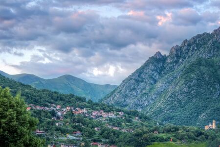 Small Italian village landscape on mountainside in lake Como district at evening sunsent