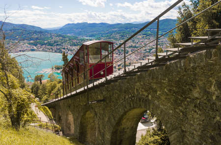 Lugano city tower beside funicular rail and Lugano lake in the background