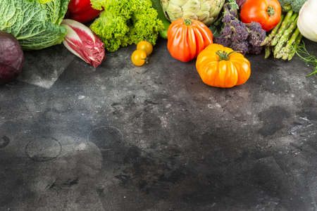 Fresh colorful organic vegetables from above. Top view, flat lay. Different vegetables for eating healthy on dark background. Clean eating food frame.Vegetarian, vegan.