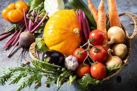 flat lay basket organic vegetables with copy space. High quality beautiful photo concept
