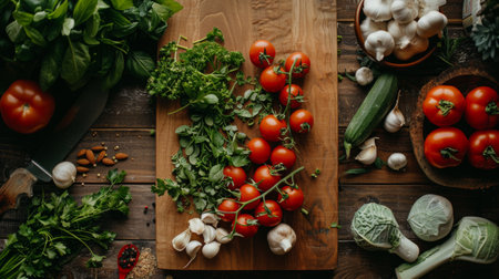 A beautiful arrangement of fresh organic vegetables and herbs on a wooden table, showcasing a basket of greens and vibrant tomatoes, perfect for culinary inspiration and healthy cooking.