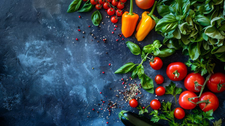 A top-down view of vibrant vegetables including tomatoes, peppers, and greens arranged with herbs and spices on a dark, textured background.