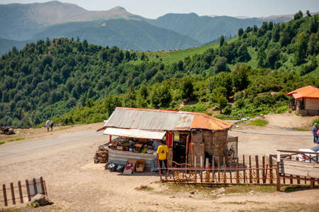 Beautiful nature with country cottages and traditional wooden houses on the road through the Goderdzi Pass in Georgia.
