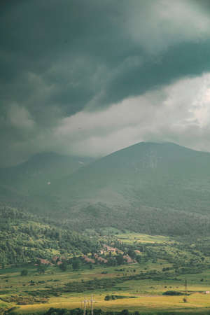View of high plateau village, forest and mountain in fog creating beautiful nature scene. The image is captured in Trabzon/Rize area of Black Sea region located at northeast of Turkey.