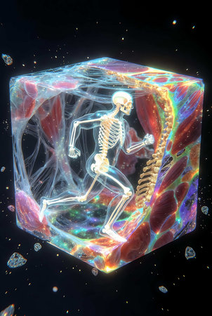 3D illustration of a human skeleton in a cube of multicolored crystals