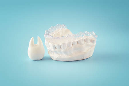Orthodontic dental theme on blue background.Transparent invisible dental aligners or braces aplicable for an orthodontic dental treatment