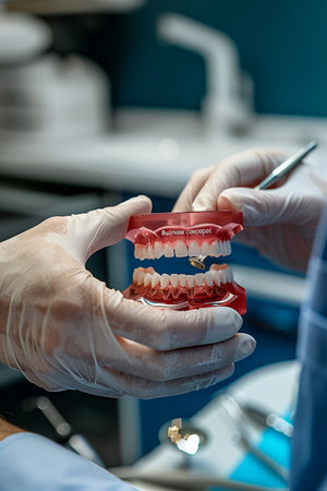 dentist wearing medical gloves shows patient jaw model before starting treatment in dental clinic, healthcare concept.