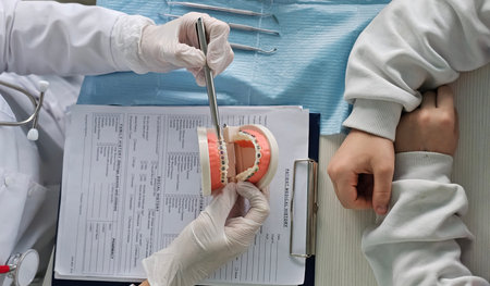 Dentist shows a teenager a dental jaw with braces