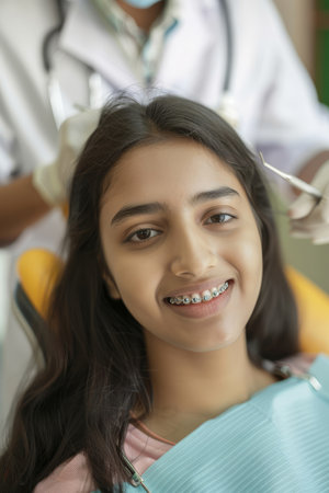 Cropped portrait of a gorgeous Indian woman with braces sitting in a dental chair. Doctor in gloves holding examination tools behind. Braces, alignment of teeth.