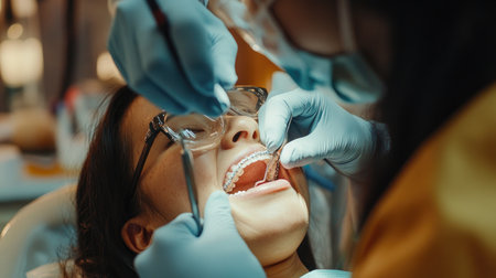 A woman with braces visits an orthodontist, in a dental chair. during the procedure of installing the arch of braces on the lower teeth. The dentist is wearing gloves and holding a pair of forceps.
