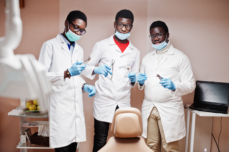 Three african american male doctors colleagues with tools at hands in clinic.
