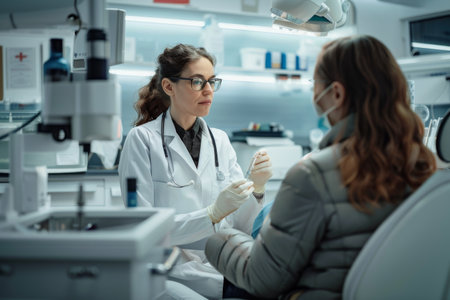 Dentist examines patient with focused attention in clear clinical setting during routine checkup