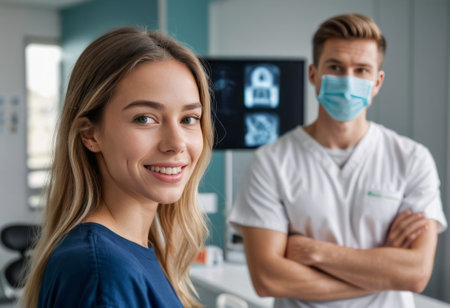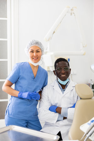 Positive confident dentist with female assistant in dental office