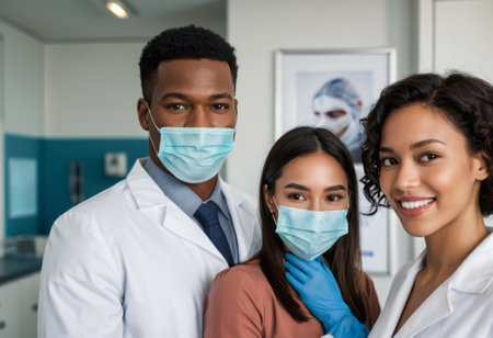 A group of dermatologists of mixed race observe as a professor the girl a black woman heals teeth