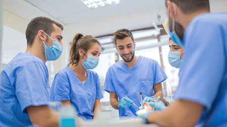 A group of dental professionals collaborates with enthusiasm while providing patient care in a modern clinic, emphasizing teamwork and skill in healthcare.