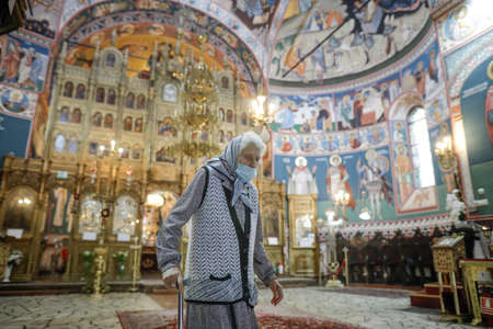 Snagov, Romania - June 21, 2020: Senior woman wearing a Covid-19 mask is praying outside a Orthodox Christian church.