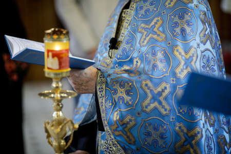 Bucharest, Romania - May 24, 2020: Details with the hand of an Orthodox priest holding a Bible and a cross during an Orthodox Baptism.