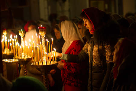 Belarus, Gomel, on April 8, 2018. The Nikolsky Monastery. The celebration of Orthodox Easter. A woman in the church lights a candle.