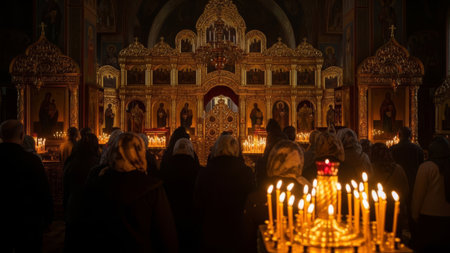 People praying in a dimly lit church with ornate iconostasis