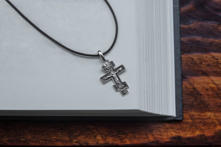 Silver necklace with crucifix cross on christian holy bible book on black wooden table. Asking blessings from God with the power of holiness, which brings luck