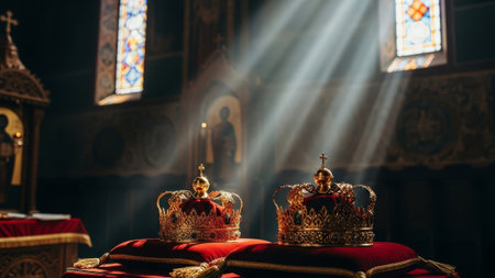 Royal crowns on velvet cushions in church, light rays stream through stained glass.