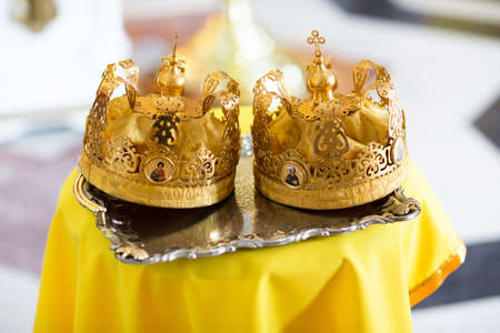 Close-up of details from church ceremony at wedding, holy cross and wedding crowns