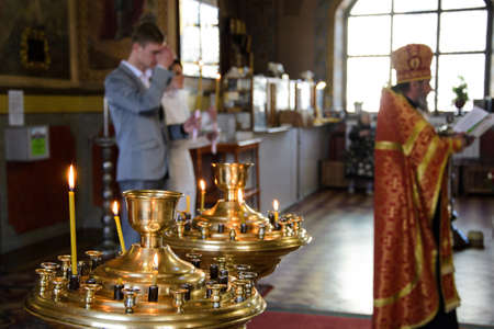 Church ordinance orthodox and wedding, church wedding, religious of a child in church, icons, Orthodox church, candles, interior of the Orthodox Church, bible, font