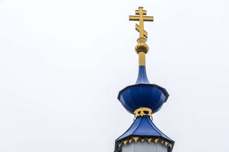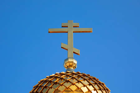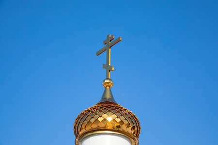Golden cross and dome of the Orthodox Church against the blue sky. Close-up