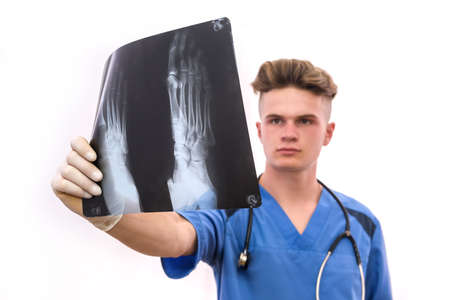 Doctor examining patient's x-ray. Young man in blue uniform holding foot x-ray and looking on it