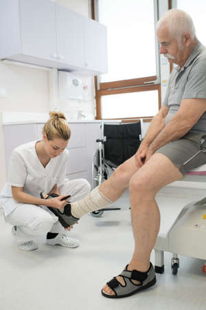 young sanitary girl reassuring an elderly person after bandaging her foot