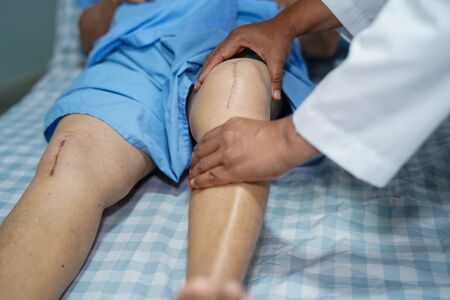 Asian senior or elderly old lady woman patient show her scars surgical total knee joint replacement Suture wound surgery arthroplasty on bed in nursing hospital ward, healthy strong medical concept.
