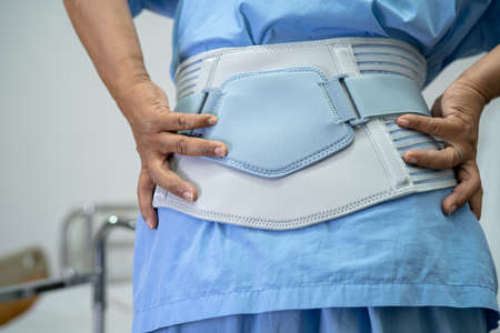 Asian lady patient wearing back pain support belt for orthopedic lumbar with walker.
