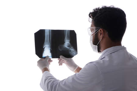 Medical concept. Young doctor examining patient's x-ray isolated on white