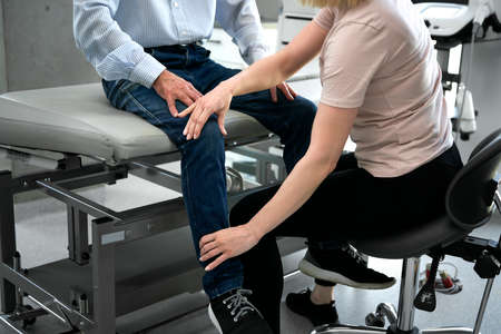 Male patients consulted physiotherapists with knee pain problems for examination and treatment. Rehabilitation physiotherapy concept.