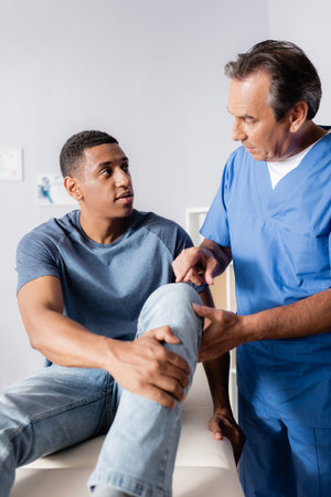 mature therapist pointing with finger at injured knee of african american man in clinic