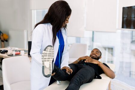 African woman doctor orthopedist examining patient in clinic. Close-up of female physiotherapist examining the leg of male patient in a physio room