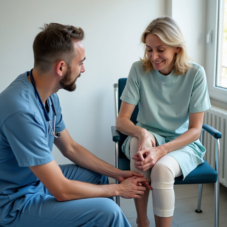 Orthopedic doctor consulting with a patient about knee issues, showing various knee models.