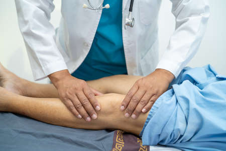 Asian doctor physiotherapist examining, massaging and treatment knee and leg of senior patient in orthopedist medical clinic nurse hospital.