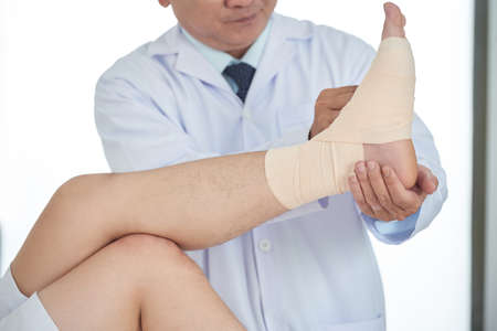 Unrecognizable medical practitioner fastening bandage on injured leg of crop man while working in office