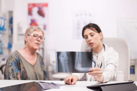 Doctor holding x-ray and talking with senior patient about knee injury in hospital office. Medic talking about therapy with mature woman.