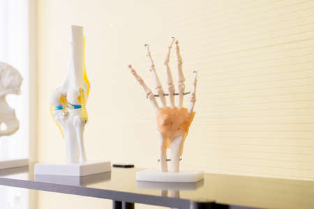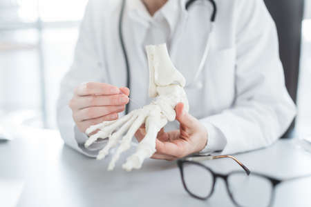 close-up hand wear medical gloves doctor in medical gloves holds artificial boneof the foot in hospital.