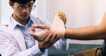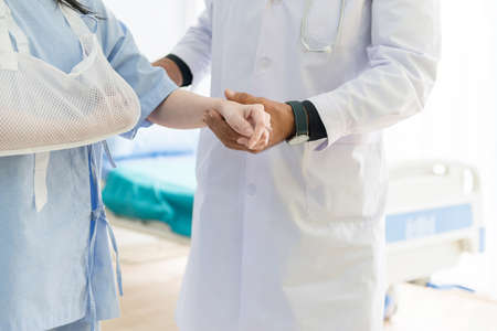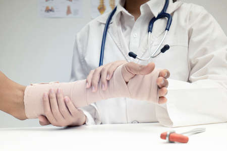 Surgeon holds female hand tightly wrapped with elastic bandage after the surgery