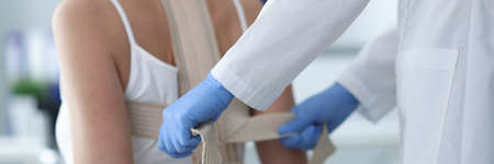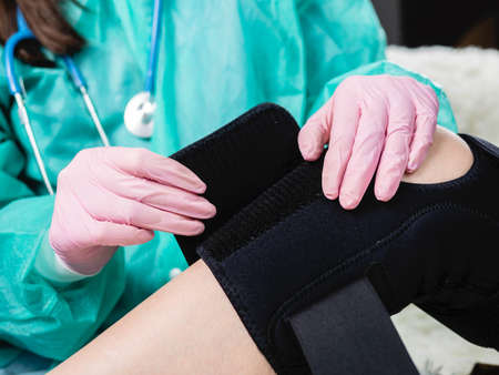 Physiotherapist helps a woman put on a brace after leg surgery. Close-up of a doctors hand