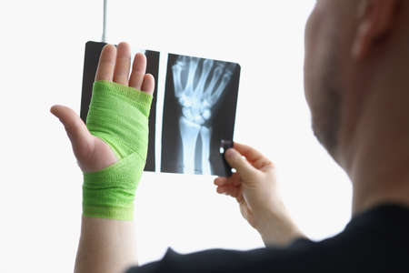 A doctor or radiologist holds an X-ray of a patient with a hand injury. Diagnosis of fractures, fractures of bones and dislocations of the joints of the arm