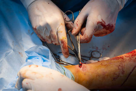 Surgeon begins to sew the wound on the leg after the operation emergency room.